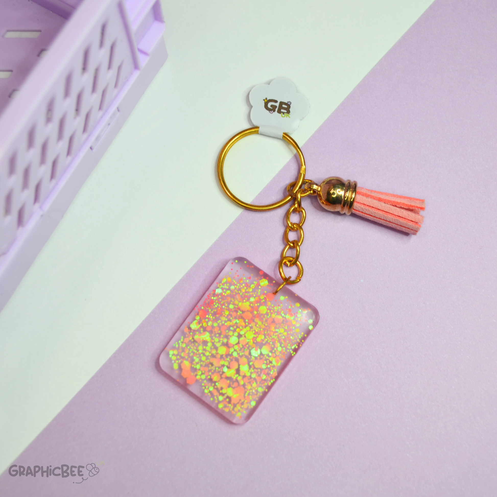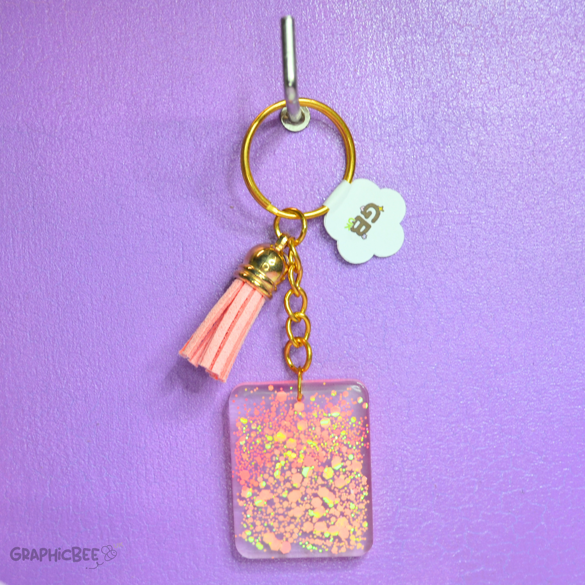 Orange & Pink Glitter Square & Tassel Resin Keyring