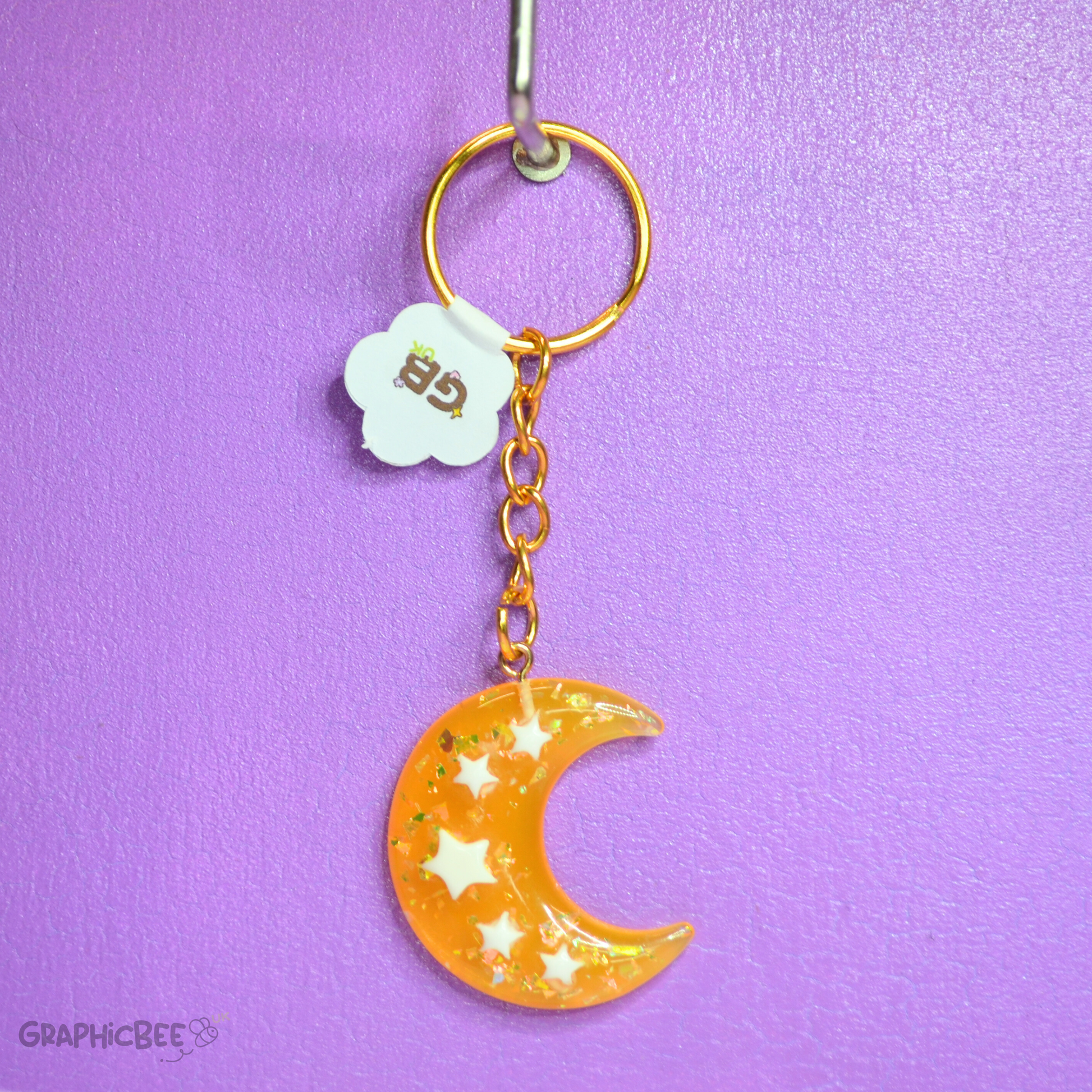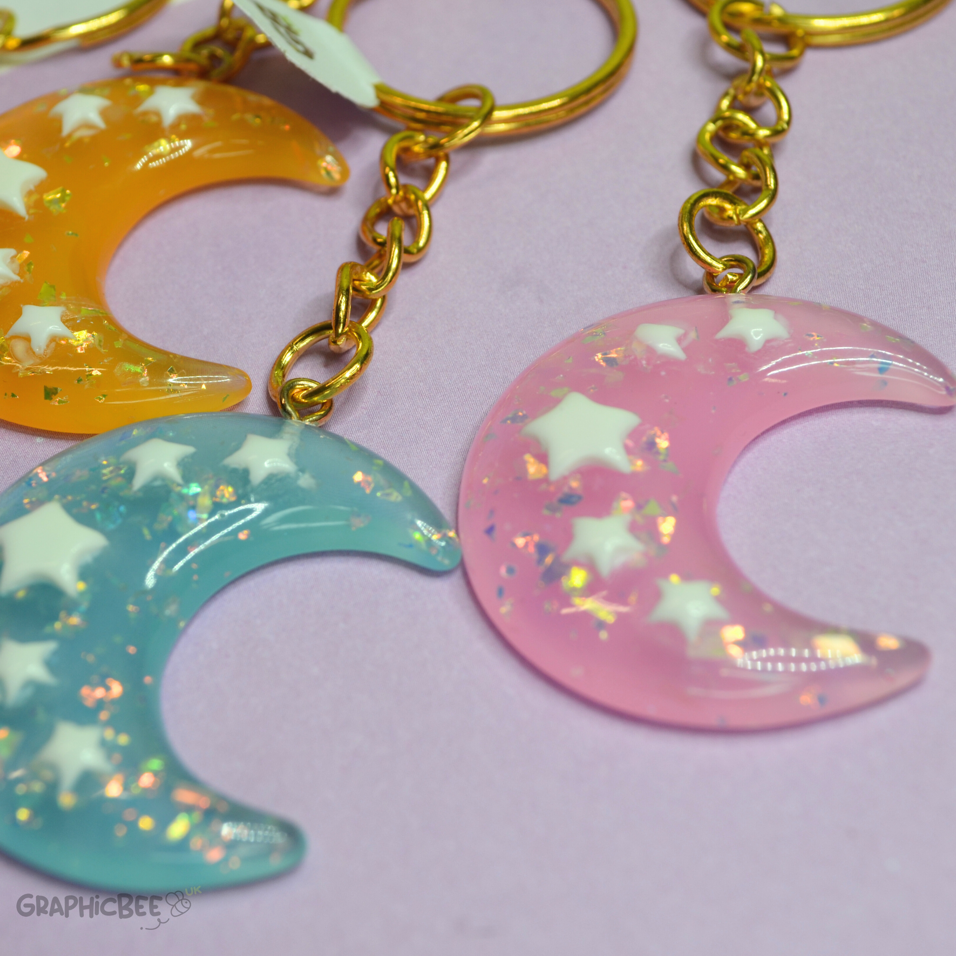 Add a celestial sparkle to everyday essentials with these enchanting crescent moon keyrings. Made from acrylic with an iridescent marbled design, it is available in four colors. Features a sturdy gold-colored chain and clasp for secure attachment. Great as a gift or to elevate your accessory game.